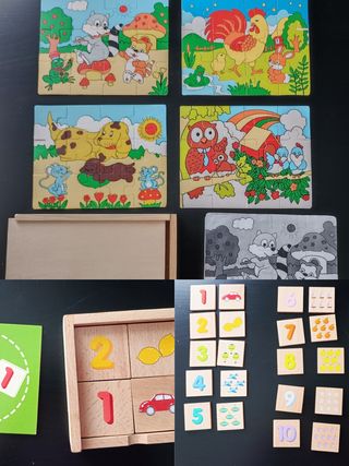 Set de 4 puzzles de colores para niños a partir de 2 años. Cada puzzle tiene un diseño diferente y piezas grandes. - Incluye 4 puzzles individuales. - Diseños variados con animales y objetos. - Piezas de cartón resistentes y piezas de madera. Como nuevo.