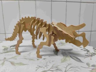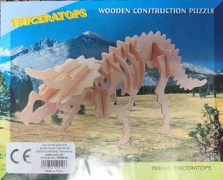 Puzzle de dinosaurio triceratops de madera, las medidas del producto son las del dinosaurio desmontado, y metiendo las piezas en la plantilla