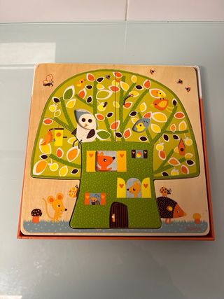 Puzzle de Djeco con diseño de casita en el árbol. Este juego está compuesto por 3 niveles de dificultad. - Ilustración colorida con animales del bosque. - Piezas de madera. - Marca: Djeco.