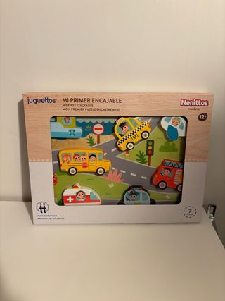 Puzzle de madera Mi Primer Encajable de Juguettos y Nenittos. - Incluye 7 piezas de vehículos. - Diseñado para apilar y encajar. - Ideal para los más pequeños.