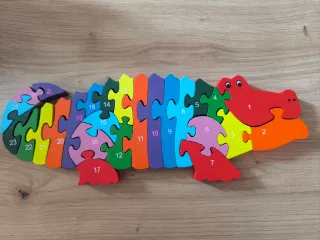 Divertido puzzle de madera con forma de cocodrilo. Las piezas están numeradas del 1 al 26 por un lado y de la A a la Z por el otro, y presentan diferentes formas y colores. - Piezas de madera. - Diseño de cocodrilo. - Numerado del 1 al 25. - Con el alfabeto por detrás - Colores y formas variados. Si te llevas algo más, el lote sale más económico.