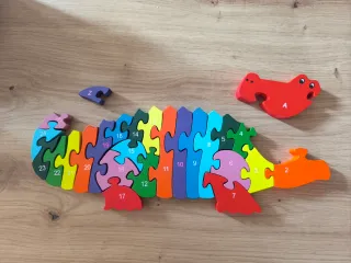 Divertido puzzle de madera con forma de dinosaurio y números de colores. Ideal para el aprendizaje temprano. Nuevo sin apenas uso - Piezas de madera. - Diseño de dinosaurio. - Números del 1 al 16.