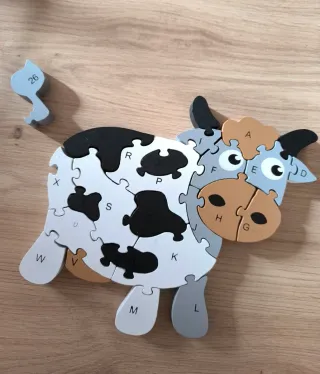 Divertido puzzle de madera con forma de vaca. Las piezas están decoradas con letras y números para aprender jugando. - Piezas de madera. - Diseño de vaca con manchas. - Incluye letras del abecedario y números. - Formas diferentes. En lote hay descuentos