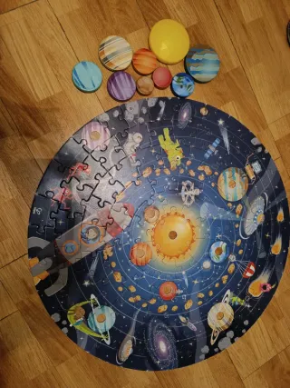 Puzzle circular del sistema solar con divertidos personajes y naves espaciales, con signos de uso. -93 piezas de puzzle -8 Planetas de madera - sol de plástico - Diseño educativo del espacio. - Piezas de cartón resistentes.