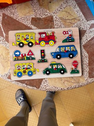 Rompecabezas de madera para niñ@s de la marca Goula. Está en muy buen estado. - 9 piezas de madera. - Colores vivos y atractivos. - Motivos infantiles: animales, vehículos y objetos cotidianos. - Algunas marcas de uso.