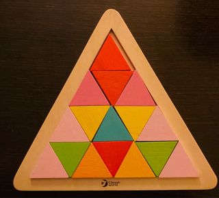 Set de piezas de madera con forma de triángulo para juegos de construcción y puzles. - Piezas de madera de colores variados. - Incluye tarjetas con diseños para armar. - Base de madera con forma de triángulo.