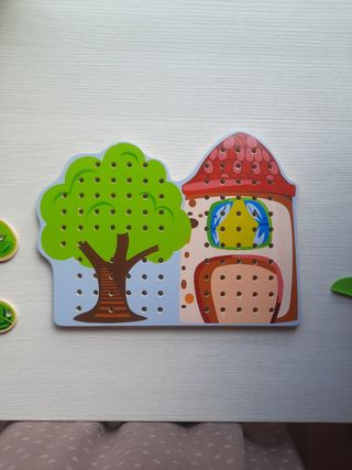 puzzle de madera con cuerdas. Las piezas se montan en el tablero con cuerdas como si estuvieras cosiendo. Múltiples opciones para poner los animales y las frutas.
