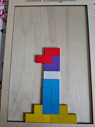 Puzzle tetris de madera. Empezando con una de las composiciones que aparecen en la hoja adjunta, intentar rellenar todo el tablero con las piezas restantes. Muy entretenido.