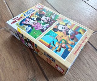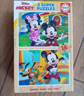 Dos puzzles de madera de Mickey Mouse y sus amigos. ¡Perfectos para los más pequeños! - 2 puzzles de 16 piezas cada uno. - De madera. - Motivos de Mickey, Minnie y Pluto. - En perfecto estado.