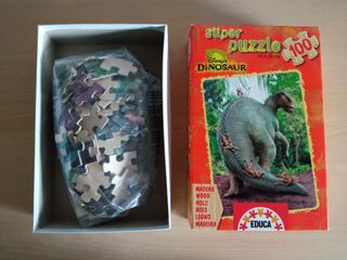 Puzzle de 100 piezas de madera de la marca Educa, con una ilustración de un dinosaurio y monos. El puzzle está completo y en buen estado, listo para disfrutar. - 100 piezas de madera. - Ilustración de dinosaurio Disney. - Marca Educa.