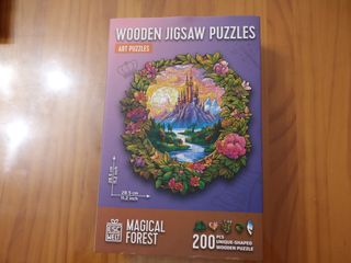 Preciosa ilustración de un bosque mágico con un castillo. El rompecabezas de madera está prácticamente nuevo. - Rompecabezas de 200 piezas. - Piezas de madera con formas únicas. - Medidas aproximadas: 28.5 cm x 28.5 cm. - Diseño de un bosque encantado con un castillo.