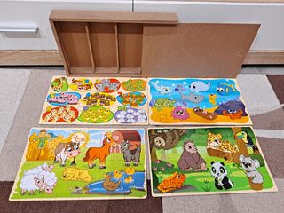 4 Puzzles de diferentes temática con caja de madera para guardar.