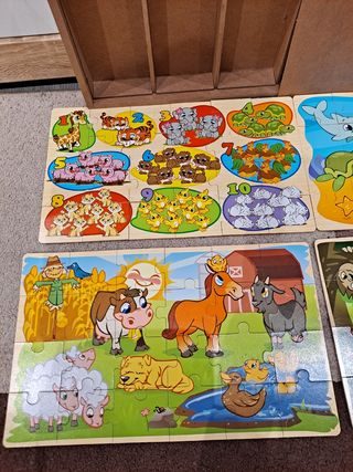 Puzzle educativo infantil de madera con figuras de animales, letras, números, frutas l, transportes...con poco uso.