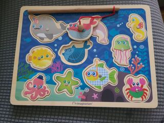 Puzzle de madera imantado. Tiene una caña para "pescar" las piezas. Ideal para los mas pequeños. Esta nuevo