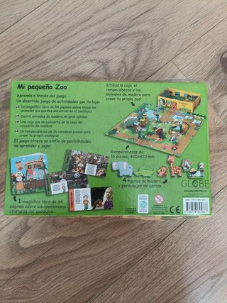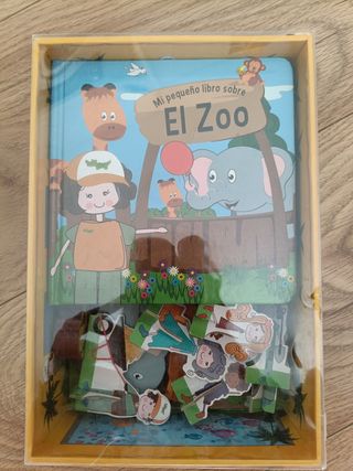 Juego de actividades que incluye un puzzle de 16 piezas, 4 animales de madera, un libro sobre el zoo y 6 figuritas para jugar. Está completo y en la caja original.