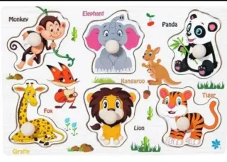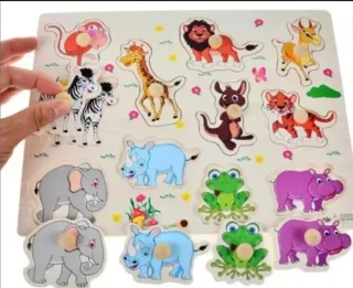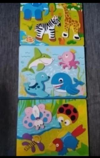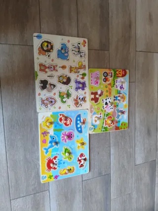 Set de 3 puzzles de madera para bebés con diferentes animales. Viene con caja de madera para guardarlo. - Diseños coloridos y atractivos. - Piezas con pomos para fácil agarre. - Fomenta el aprendizaje y la motricidad fina. Con muy poco uso