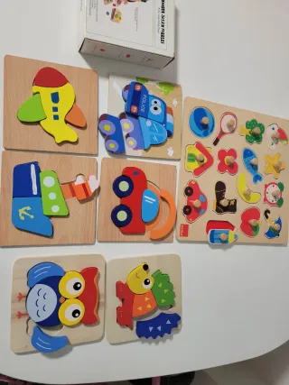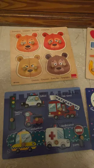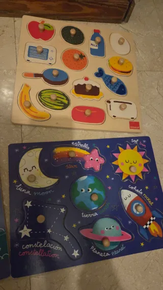 Cuatro puzzles de madera para niños pequeños, uno de comida, otro del espacio,transportes y emociones. - Puzzle de comida con 12 piezas. - Puzzle del espacio con 10 piezas. - Diseños coloridos y educativos. *20 euros lote de cuatro puzzles,individuales a 6 euros por puzzle.