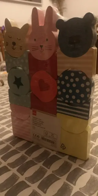 Juego de construcción de madera con 18 piezas para apilar. Fomenta la creatividad y la motricidad fina. A partir de un año. - Diseños de animales y formas. - Piezas de madera de vivos colores.