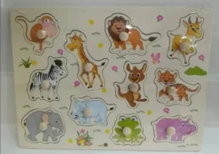 Rompecabezas de animales de madera para niñ@s. Está en muy buen estado. - Incluye 7 piezas de animales: tigre, hipopótamo, jirafa, cebra, elefante, león y cocodrilo. - Las figuras se mantienen de pie, están pintadas en ambas caras y sirven para jugar. - Ideal para desarrollar habilidades motoras finas y el aprendizaje de animales. - De la marca Mundo Diver.