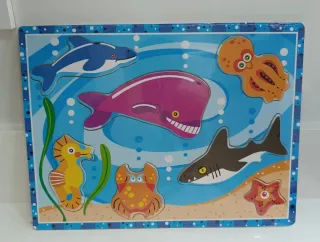 Divertido puzzle de madera con temática del océano, ideal para los más pequeños. Las piezas son de madera gruesa y fáciles de agarrar. - Incluye 7 piezas de animales marinos: delfín, ballena, pulpo, caballito de mar, cangrejo, tiburón y estrella de mar. - Diseño colorido y atractivo. Nuevo, le falta caja original. #Melissa & Doug