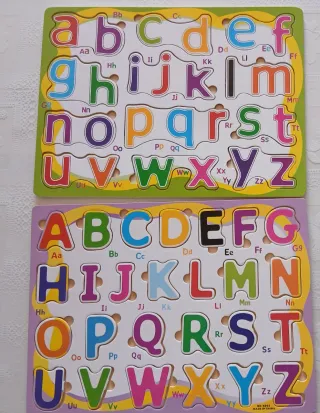 Set de puzzles de madera con números y letras del abecedario. Fomenta el aprendizaje de forma lúdica. Muy poco uso. El de las letras está nuevo. El de los números tiene un pequeño defecto en una esquina de abajo, aunque por lo demás está nuevo. - Piezas de madera resistentes. - Diseños coloridos para atraer la atención. - Incluye números del 1 al 20 y letras del abecedario.