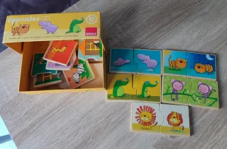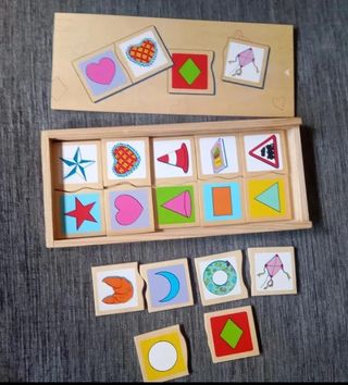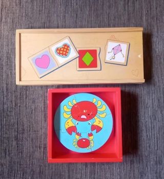 Encuentra las parejas. 20 piezas. 27x12x3 (4.5€) . 4 puzzles redondos dentro de una cajita de madera. 15x15x4 cm. (4'5€) . Si te llevas los dos 7'5€.