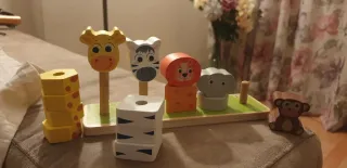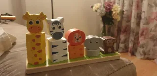 Juego de apilamiento de animales de madera. - Incluye jirafa, cebra, león, elefante y mono. - Piezas de madera con diseño de animales. - Base de madera con ranuras. - En su caja.