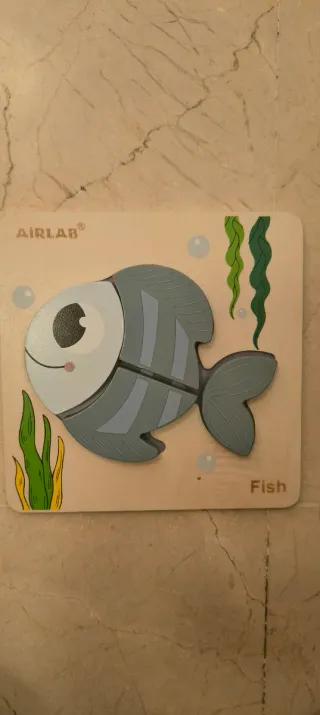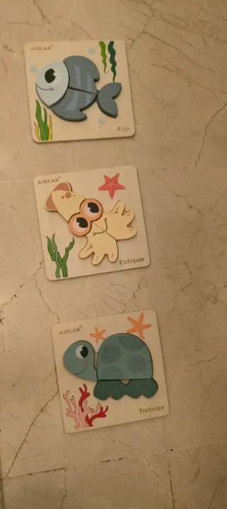 Set de 3 puzzles de madera con temática marina para niños. - Incluye un pez, un pulpo y una tortuga. - Diseños coloridos y educativos. - Piezas de madera resistentes.
