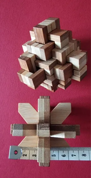 Dos rompecabezas de madera con diseños geométricos. - Fabricados en madera de bambú. - Uno tiene forma de estrella y el otro es cúbico.