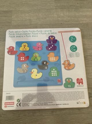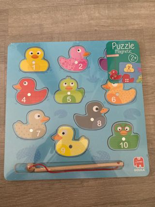 Divertido puzzle de pesca magnético con patos numerados. - Incluye 10 patos de madera con números del 1 al 10. - Caña de pescar magnética de madera. - Base de madera con diseño de agua.