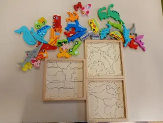 Juguetes educativos de madera para niños. Son dos puzzles, uno con vehículos y otro con dinosaurios. Ambos están en buen estado y son ideales para el aprendizaje y la diversión. - Dos puzzles de madera. - Uno con diferentes vehículos. - Otro con distintos dinosaurios. - Piezas de colores alegres.