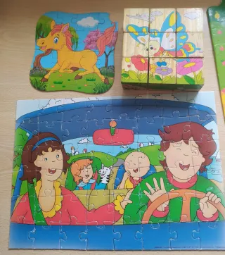 Lote de juegos y libros infantiles. - Puzzle de madera con caballo. - Puzzle de cubos con 6 puzzles diferentes - Puzzle de Caillou - Libros Pictogramas (varios títulos). - Libro Blancanieves con personajes. - Libro My Little Pony con imanes. Faltan imanes en ambos libros por eso el precio