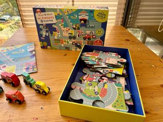 Divertido puzzle de suelo para crear un circuito de ciudad. Incluye 7 vehículos de madera para jugar. - Puzzle de 25 piezas (completo) - Circuito de ciudad con calles y edificios. - 7 coches de madera de colores. - Guía de suelo para poder montarlo