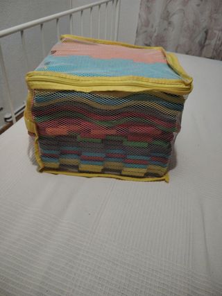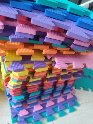 Set de 36 piezas de puzzle blandas para el suelo, ideales para niños. Se encuentran en buen estado. 30x30cm cada pieza - Colores variados: azul, rosa, amarillo, verde, naranja y morado. - Material de espuma. - Diseño entrelazado.