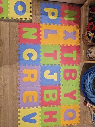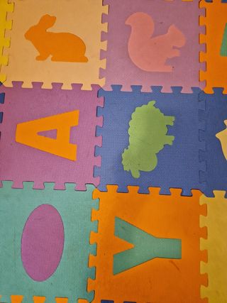 Set de piezas blandas para suelo, ideales para crear un área de juego segura y colorida. Se despegan con facilidad las letras. Tienes q ir encajandolas. - Diseño de puzzle. - Colores variados: azul, rosa, amarillo y verde. Recoger en metro Rocafort, el Rey del bocata.