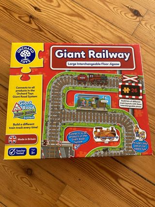 Puzzle de suelo gigante de Orchard Toys, modelo Giant Railway. Permite construir diferentes trazados de vías. - Incluye 26 piezas intercambiables. - Conecta con otros productos del sistema Giant Road. - Fabricado en Gran Bretaña. - Probado por profesores. - Edad recomendada: 3+ años. Usado, se nota sobretodo en los la dos de las piezas. Faltan dos pequeñas piezas blanca a para sujetar dos figuras de pie. Aún asi, en buen estado, pueden dar aun mucho de si. Se puede comprar en pack con el Puzzle de carretera. Si te interesa, mira el resto de productos y hazme una oferta.