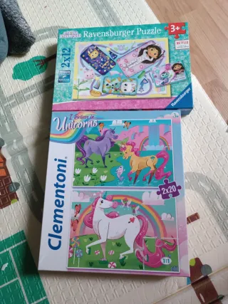 Pack de dos puzzles infantiles, uno de Ravensburger y otro de Clementoni. - Puzzle Ravensburger Gabby's Dollhouse 2x12 piezas. - Puzzle Clementoni I Believe in Unicorns 2x20 piezas.