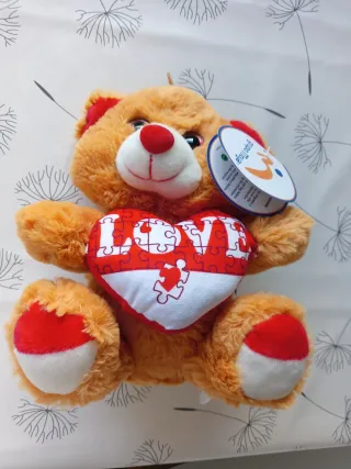 Adorable osito de peluche con un corazón decorado con la palabra LOVE y piezas de puzzle. - Peluche suave de color naranja. - Corazón rojo y blanco con diseño de puzzle. - Orejas y patas con detalles rojos.