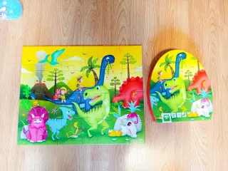Puzzle de dinosaurios en buen estado, ideal para los más pequeños. Contiene 24 piezas. - Diseño colorido con dinosaurios. - Piezas de cartón resistentes.