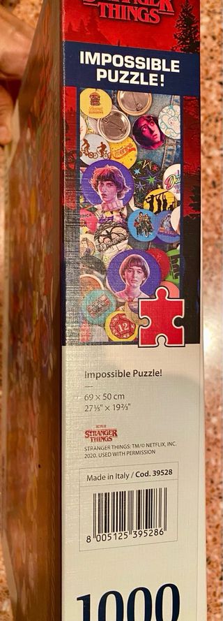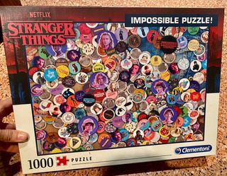 Puzzle de 1000 piezas de la serie Stranger Things de Netflix. Presenta un diseño lleno de pins y detalles. - Licencia oficial de Stranger Things. - Marca Clementoni. - Diseño Impossible Puzzle.