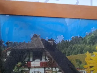 Puzzle con imagen de una casa tradicional y girasoles, incompleto. - Marco de madera. - Piezas de puzzle con imagen de casa y flores.