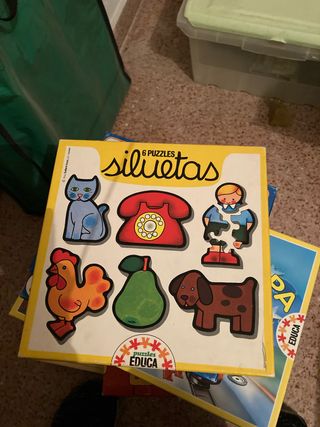 Puzzle de la marca Educa con 6 siluetas. - Incluye 6 puzzles. - Diseños de siluetas: gato, teléfono, niño, gallo, pera y perro. - Ideal para los más pequeños.