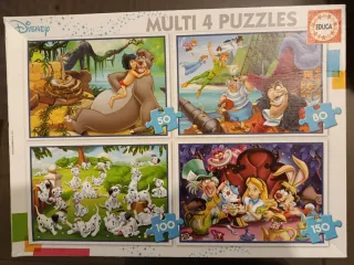 Set de 4 puzzles infantiles con personajes de Disney. Incluye 4 puzzles de diferentes tamaños y piezas. - Puzzle de El Libro de la Selva (50 piezas). - Puzzle de Peter Pan (80 piezas). - Puzzle de 101 Dálmatas (100 piezas). - Puzzle de Alicia en el País de las Maravillas (150 piezas).