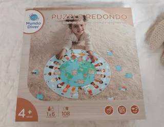 Puzzle redondo de Mundo Diver con temática del mundo y personas de diferentes culturas. - 108 piezas. - Recomendado para 1 a 6 jugadores. - Apto para mayores de 4 años. En buen estado, piezas de cartón duro grandes.