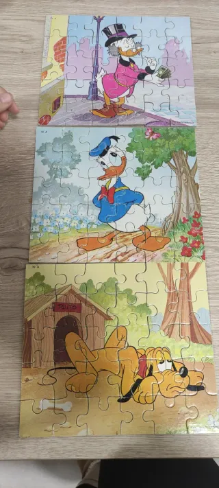 Lote de tres puzzles de Disney, cada uno con 30 piezas. - Personajes: Tío Gilito, Donald y Pluto. - Ideal para coleccionistas y fans de Disney.