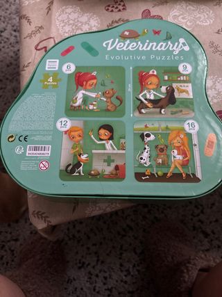Set de 4 puzzles evolutivos con temática veterinaria. - Incluye puzzles de 6, 9, 12 y 16 piezas. - Diseños coloridos y educativos. - Fabricado en España.