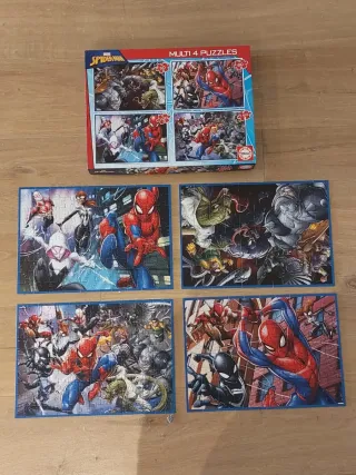 Set de 4 puzzles de Spiderman de la marca Educa. - Puzzles de 100, 50, 150 y 80 piezas. - Imágenes de Spiderman en acción. - Ideal para fans del superhéroe.
