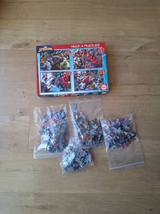 Set de 4 puzzles de Spiderman con diferentes cantidades de piezas. - Puzzle 1: 50 piezas. - Puzzle 2: 80 piezas. - Puzzle 3: 100 piezas. - Puzzle 4: 150 piezas. - Diseños variados de Spiderman y sus enemigos.