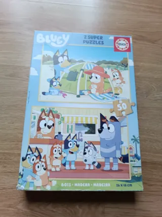 Pack de dos puzzles de Bluey, cada uno con 50 piezas. Ideal para los fans de la serie. - Incluye dos imágenes diferentes de Bluey. - Fabricado en madera. - Medidas: 26 x 18 cm.