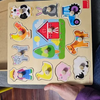 Divertido puzzle de madera con temática de animales de granja. Hace el sonido del anima cuando pones la pieza - Incluye 6 piezas de animales: pato, vaca, caballo, oveja, gallina y perro. - Base de madera con siluetas para encajar las piezas. - Ideal para el desarrollo de la motricidad fina y el reconocimiento de animales.